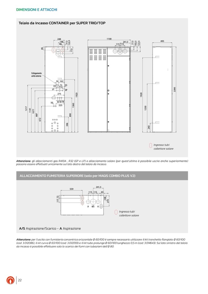 Attenzione: gli allacciamenti gas R410A , R32 (GP e LP) e allacciamento solare (per quest’ultimo è possibile uscire anche superiormente)