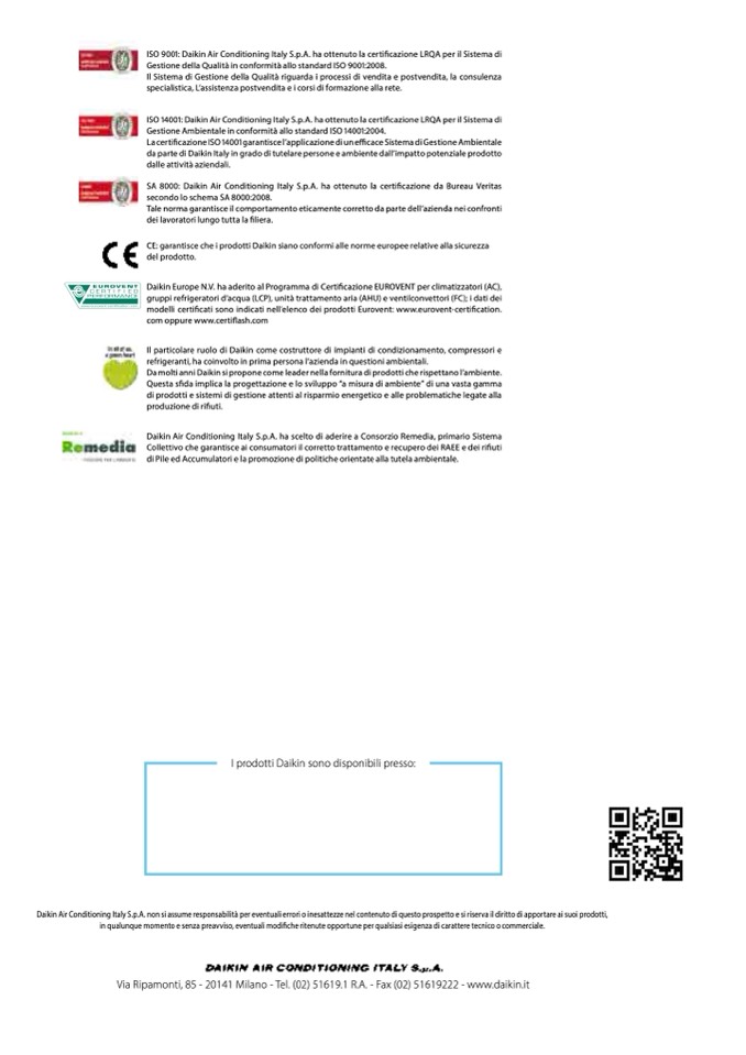Daikin Air Conditioning Italy S.p.A. non si assume responsabilità per eventuali errori o inesattezze nel contenuto di questo prospetto e si riserva il diritto di apportare ai suoi prodotti,