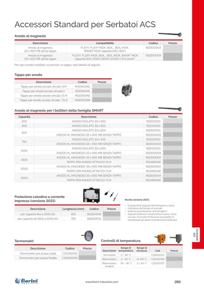 Per ogni anodo installato va previsto un tappo, vedi tabella di seguito.