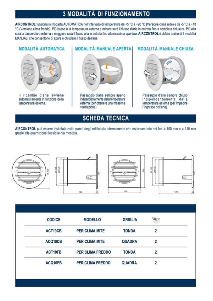 sarà la temperatura esterna e maggiore sarà il flusso aria in entrata fino alla massima apertura. AIRCONTROL è dotato anche di 2 modalità