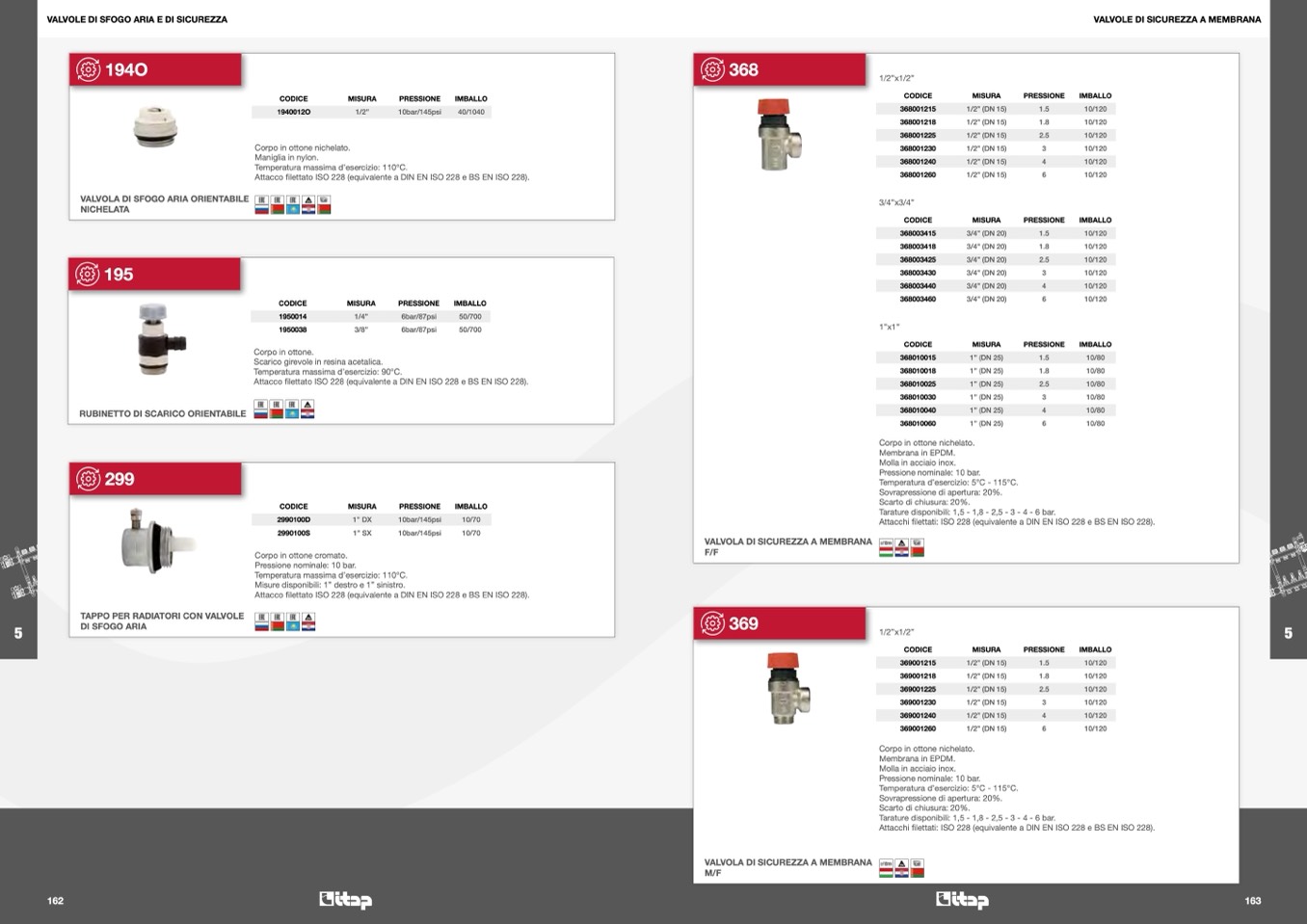 Attacchi filettati: ISO 228 (equivalente a DIN EN ISO 228 e BS EN ISO 228).