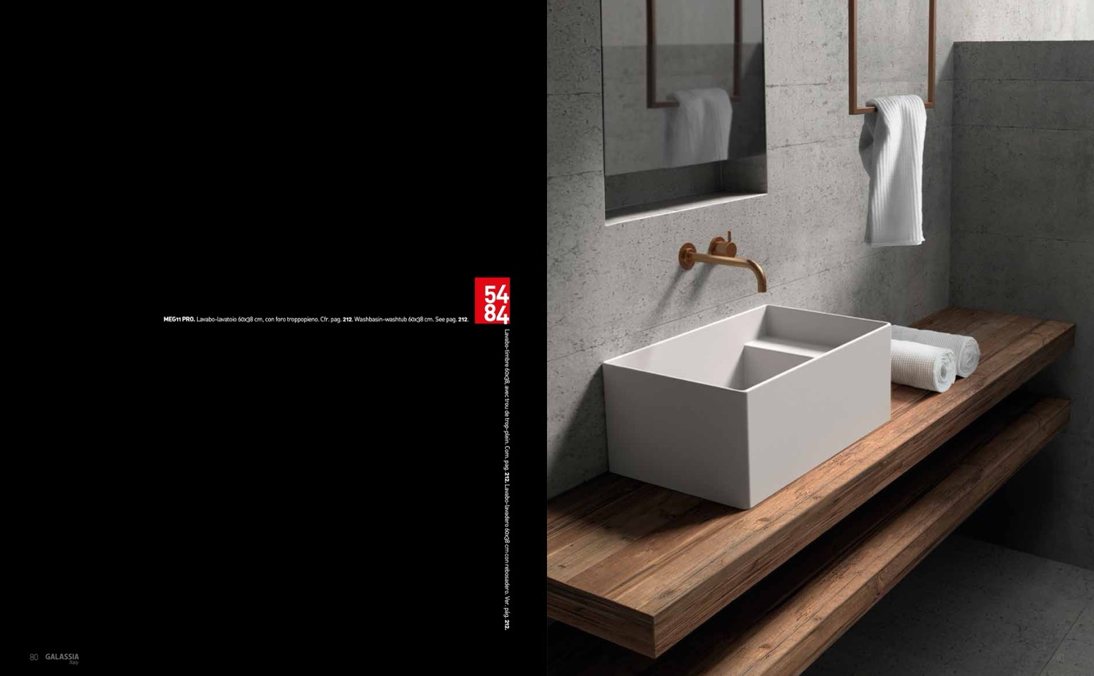 MEG11 PRO. Lavabo-lavatoio 60x38 cm, con foro troppopieno. Cfr. pag. 212. Washbasin-washtub 60x38 cm. See pag. 212.
