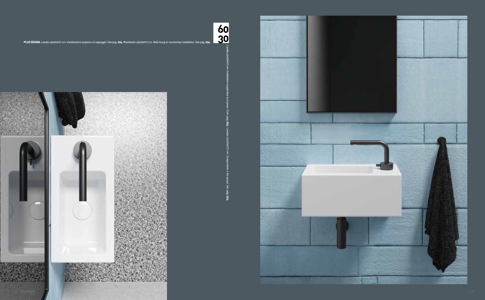 PLUS DESIGN. Lavabo 40x20xh17 cm. Installazione sospesa o in appoggio. See pag. 224. Washbasin 40x20xh17 cm. Wall-hung or countertop installation. See pag. 224.