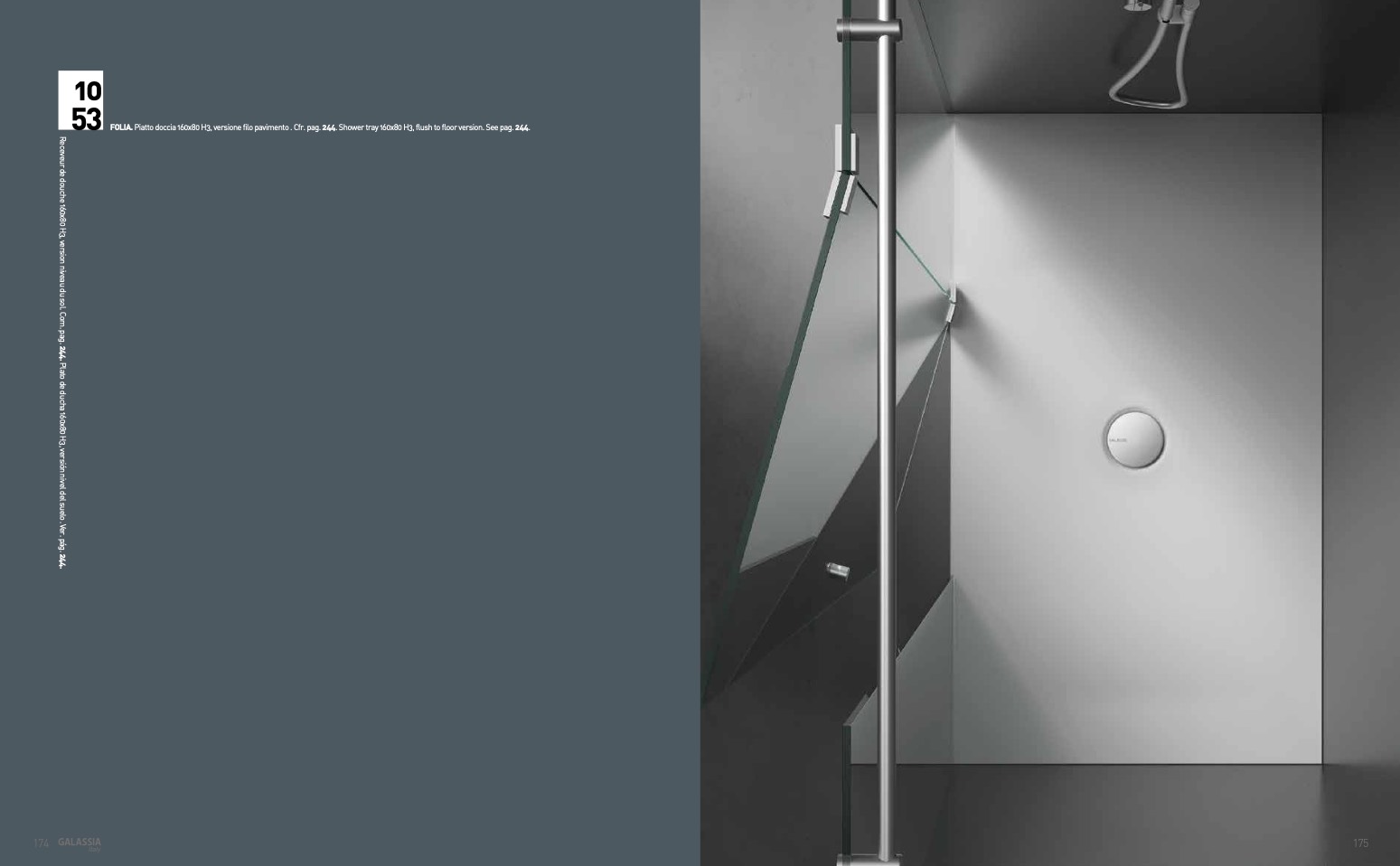 FOLIA. Piatto doccia 160x80 H3, versione filo pavimento . Cfr. pag. 244. Shower tray 160x80 H3, flush to floor version. See pag. 244.