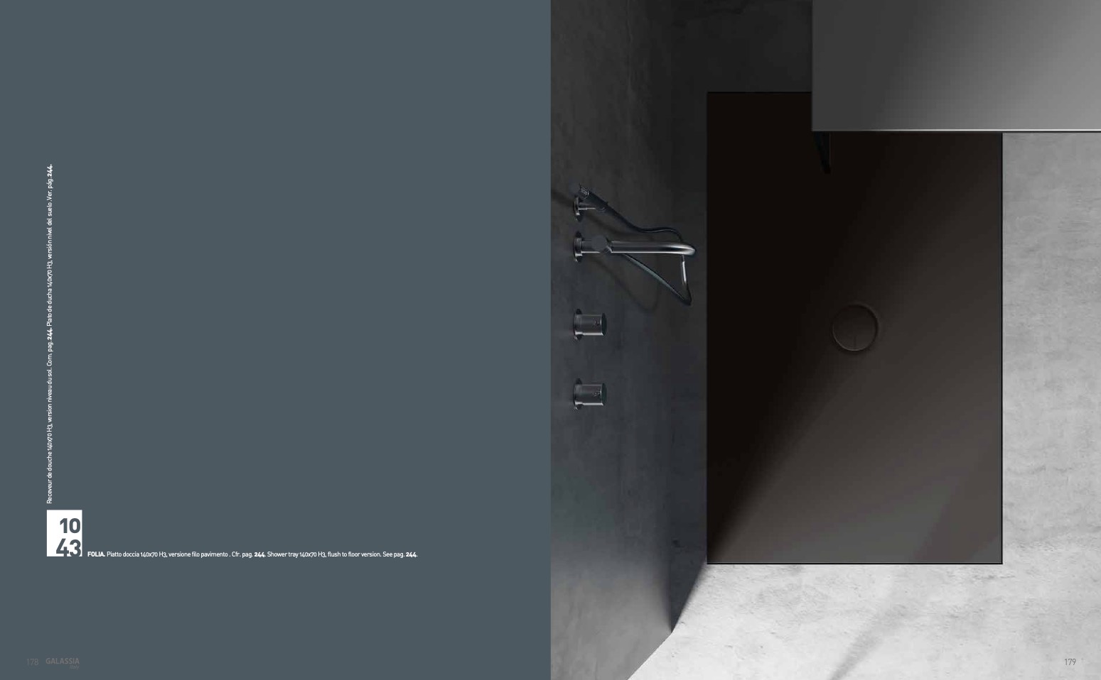 FOLIA. Piatto doccia 140x70 H3, versione filo pavimento . Cfr. pag. 244. Shower tray 140x70 H3, flush to floor version. See pag. 244.