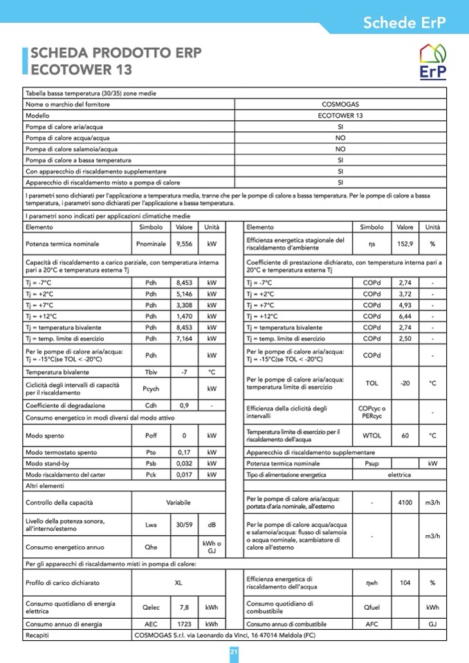 I parametri sono dichiarati per l’applicazione a temperatura media, tranne che per le pompe di calore a bassa temperatura. Per le pompe di calore a bassa