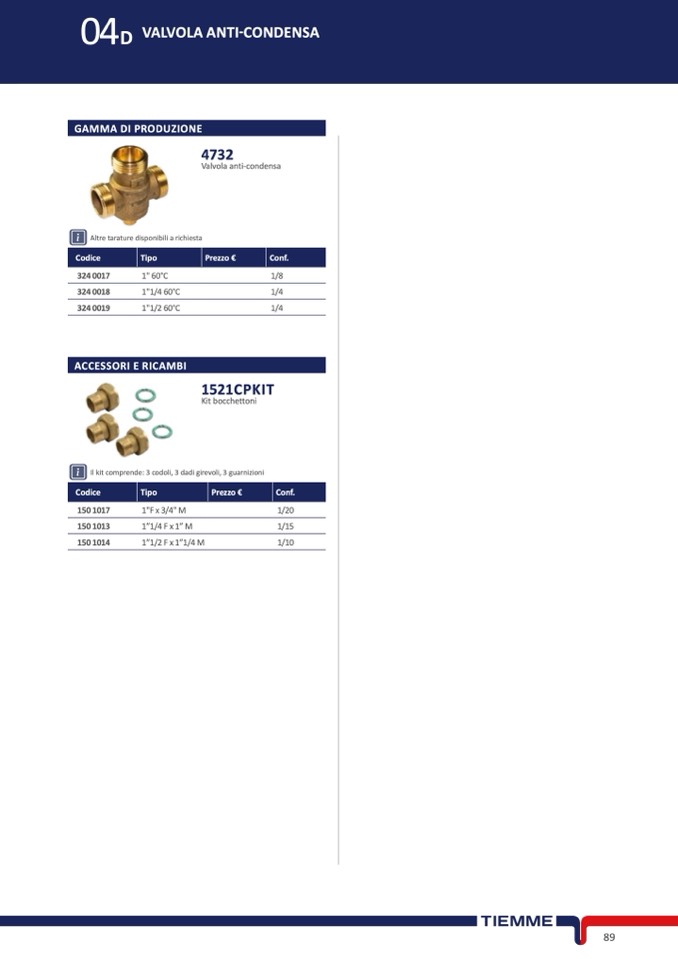 Il kit comprende: 3 codoli, 3 dadi girevoli, 3 guarnizioni