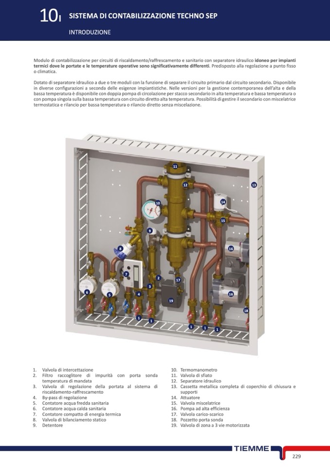 Modulo di contabilizzazione per circuiti di riscaldamento/raffrescamento e sanitario con separatore idraulico idoneo per impianti