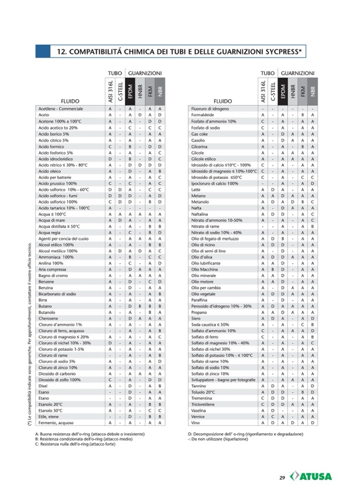 12. COMPATIBILITÁ CHIMICA DEI TUBI E DELLE GUARNIZIONI SYCPRESS*