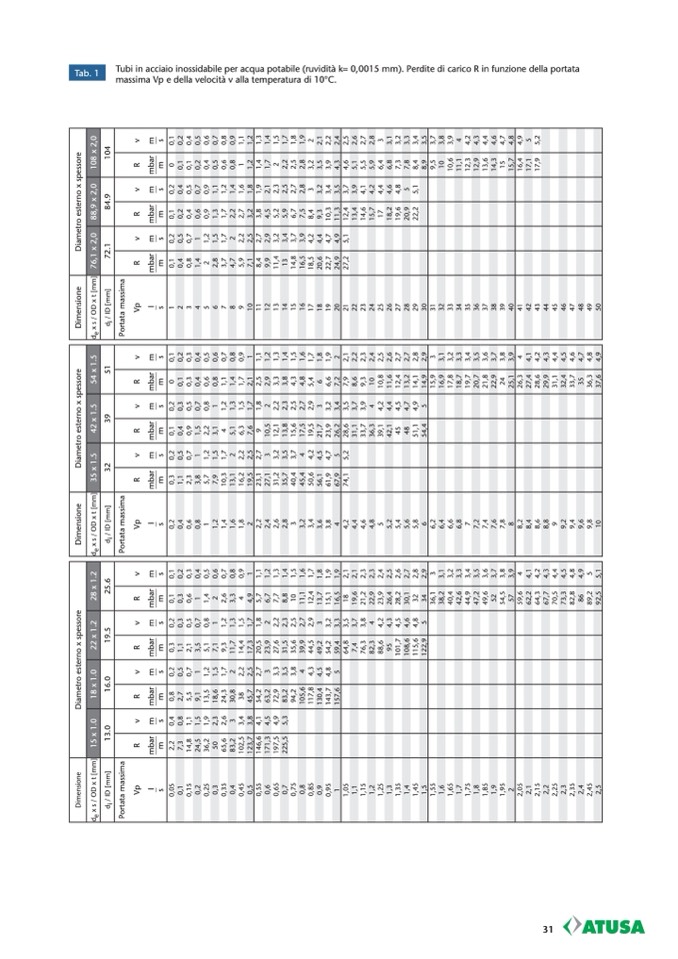 Tubi in acciaio inossidabile per acqua potabile (ruvidità k= 0,0015 mm). Perdite di carico R in funzione della portata