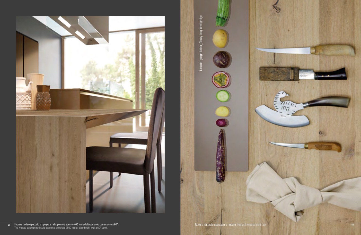 The knotted split oak peninsula features a thickness of 60 mm at table height with a 60° bevel.