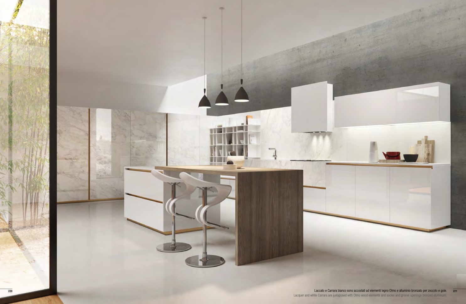 Laccato e Carrara bianco sono accostati ad elementi legno Olmo e alluminio bronzato per zoccolo e gole.