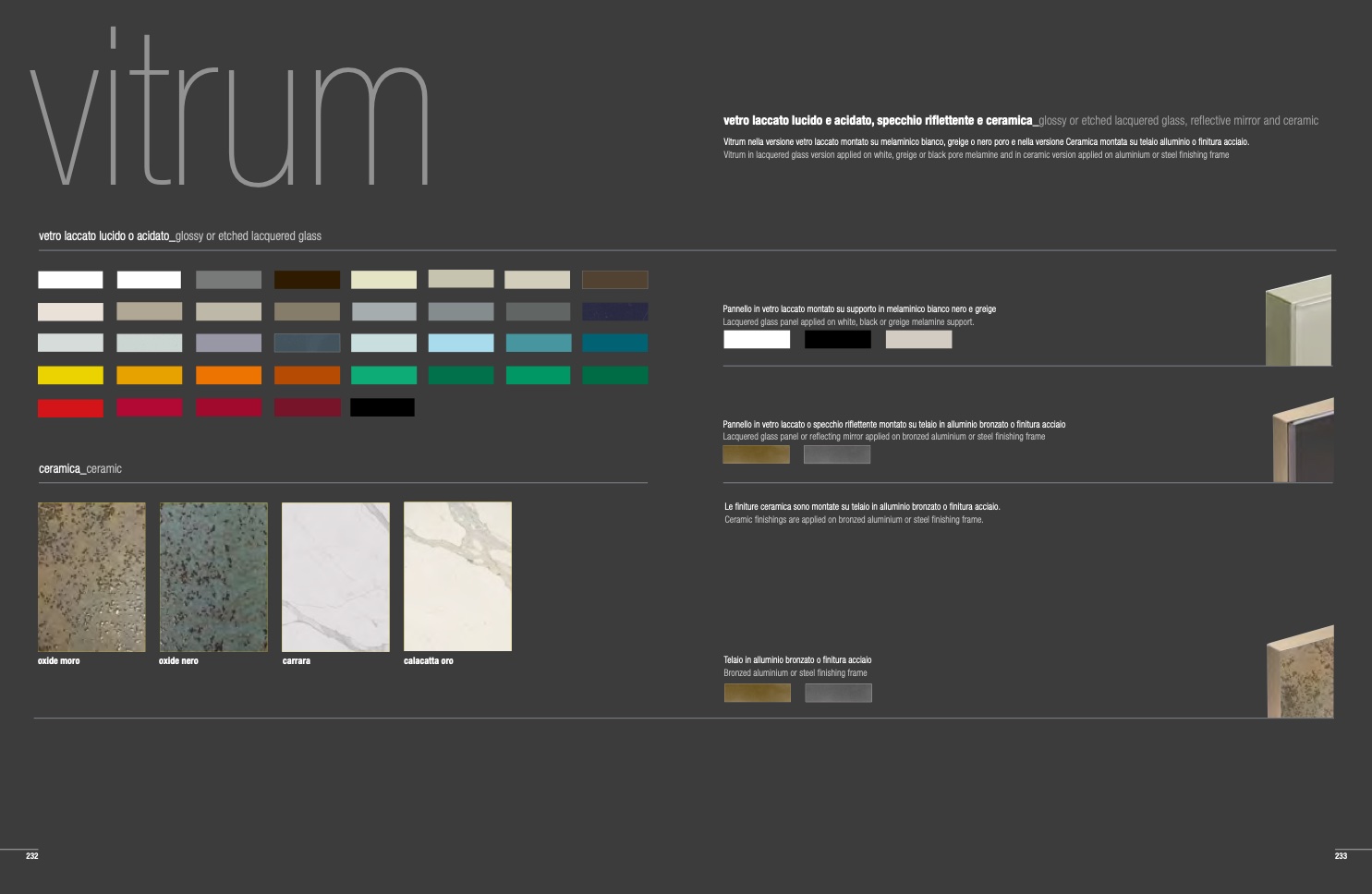 Vitrum nella versione vetro laccato montato su melaminico bianco, greige o nero poro e nella versione Ceramica montata su telaio alluminio o finitura acciaio.