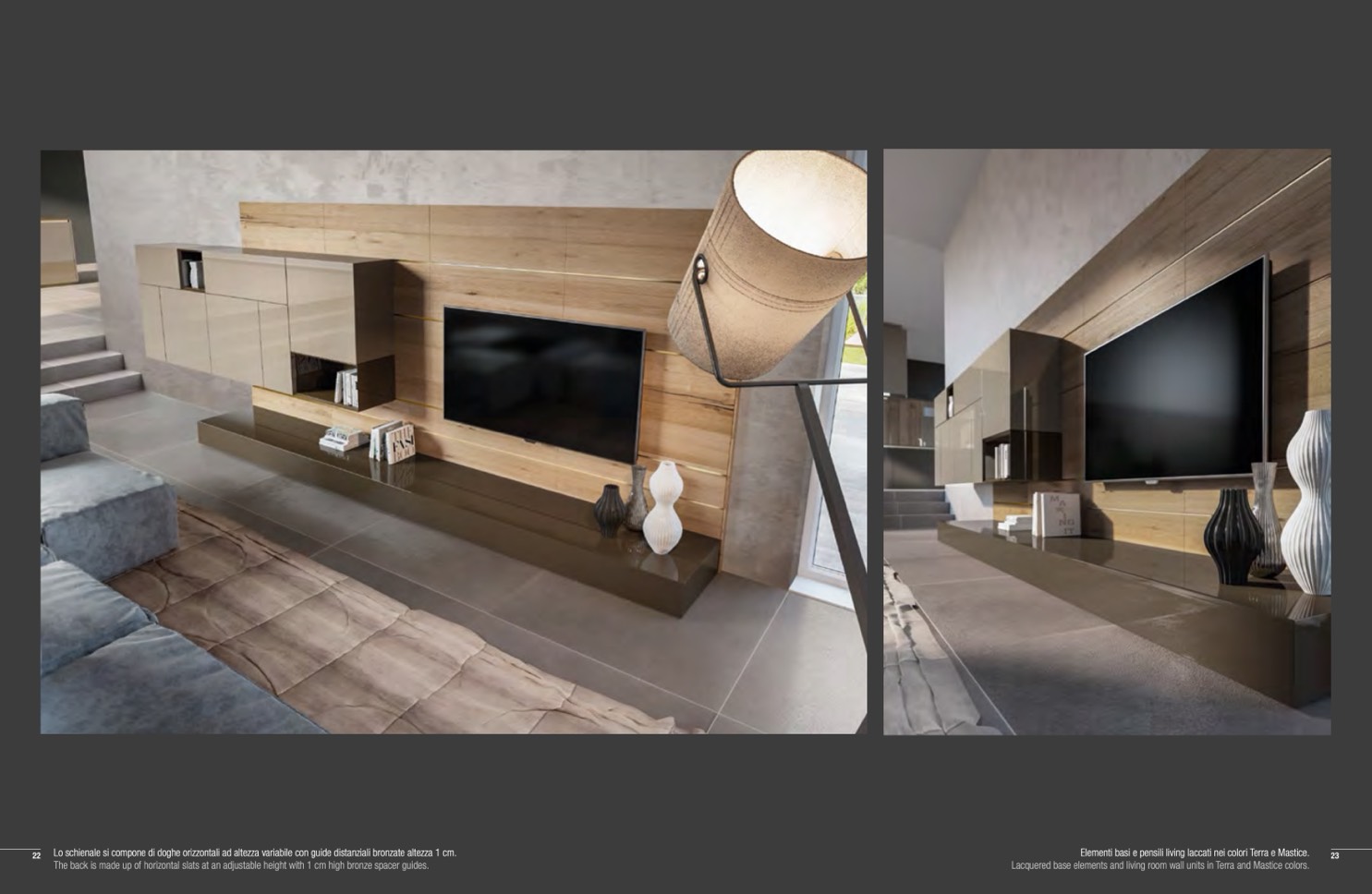Lacquered base elements and living room wall units in Terra and Mastice colors.