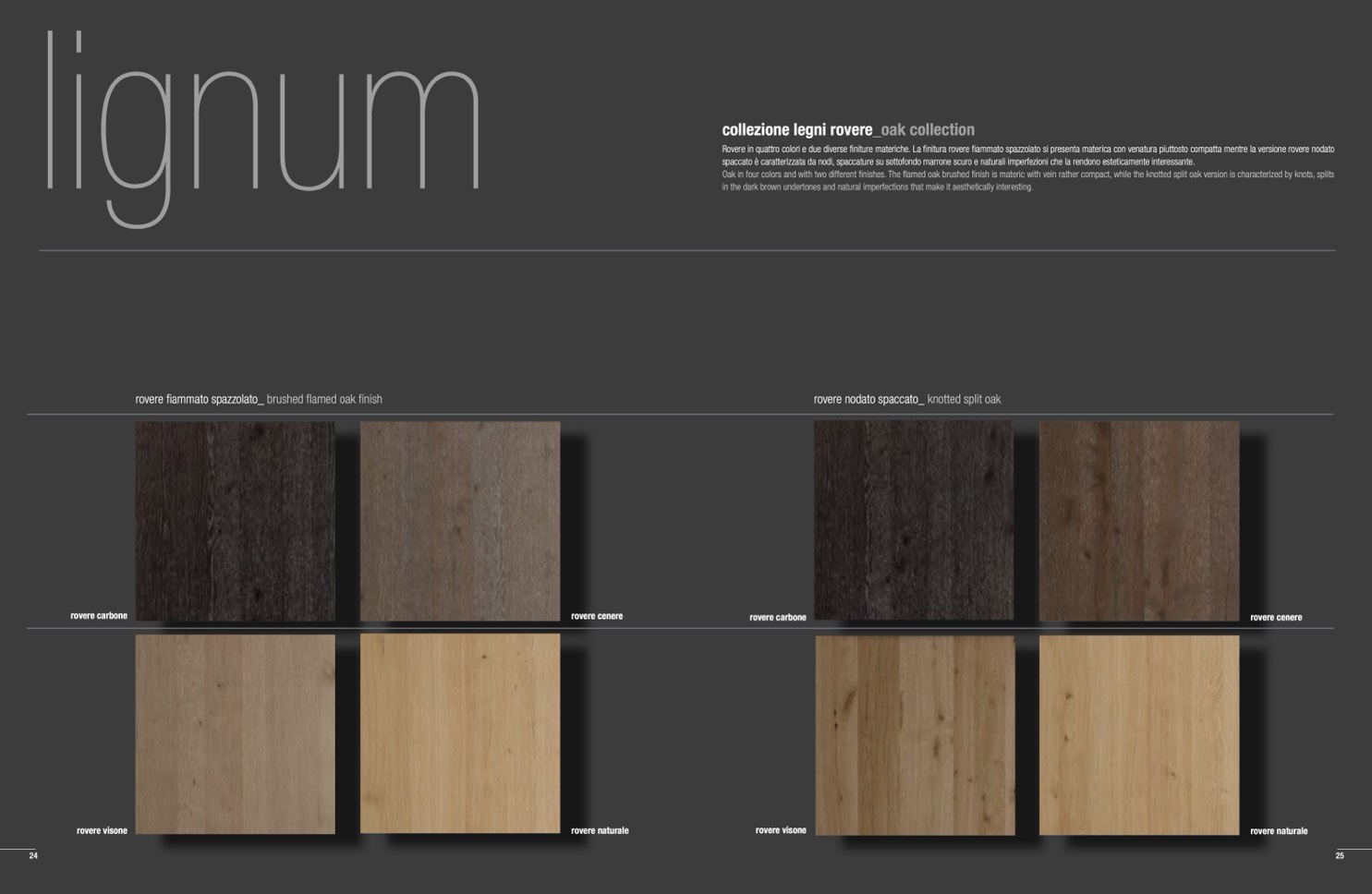 Oak in four colors and with two different finishes. The flamed oak brushed finish is materic with vein rather compact, while the knotted split oak version is characterized by knots, splits