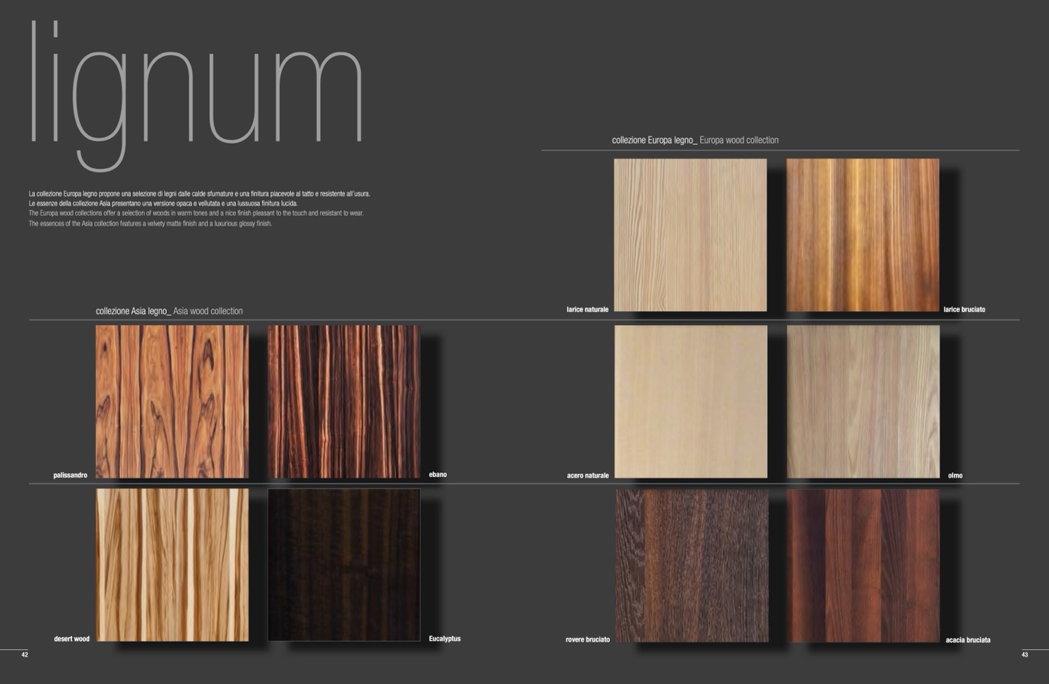 La collezione Europa legno propone una selezione di legni dalle calde sfumature e una finitura piacevole al tatto e resistente all’usura.