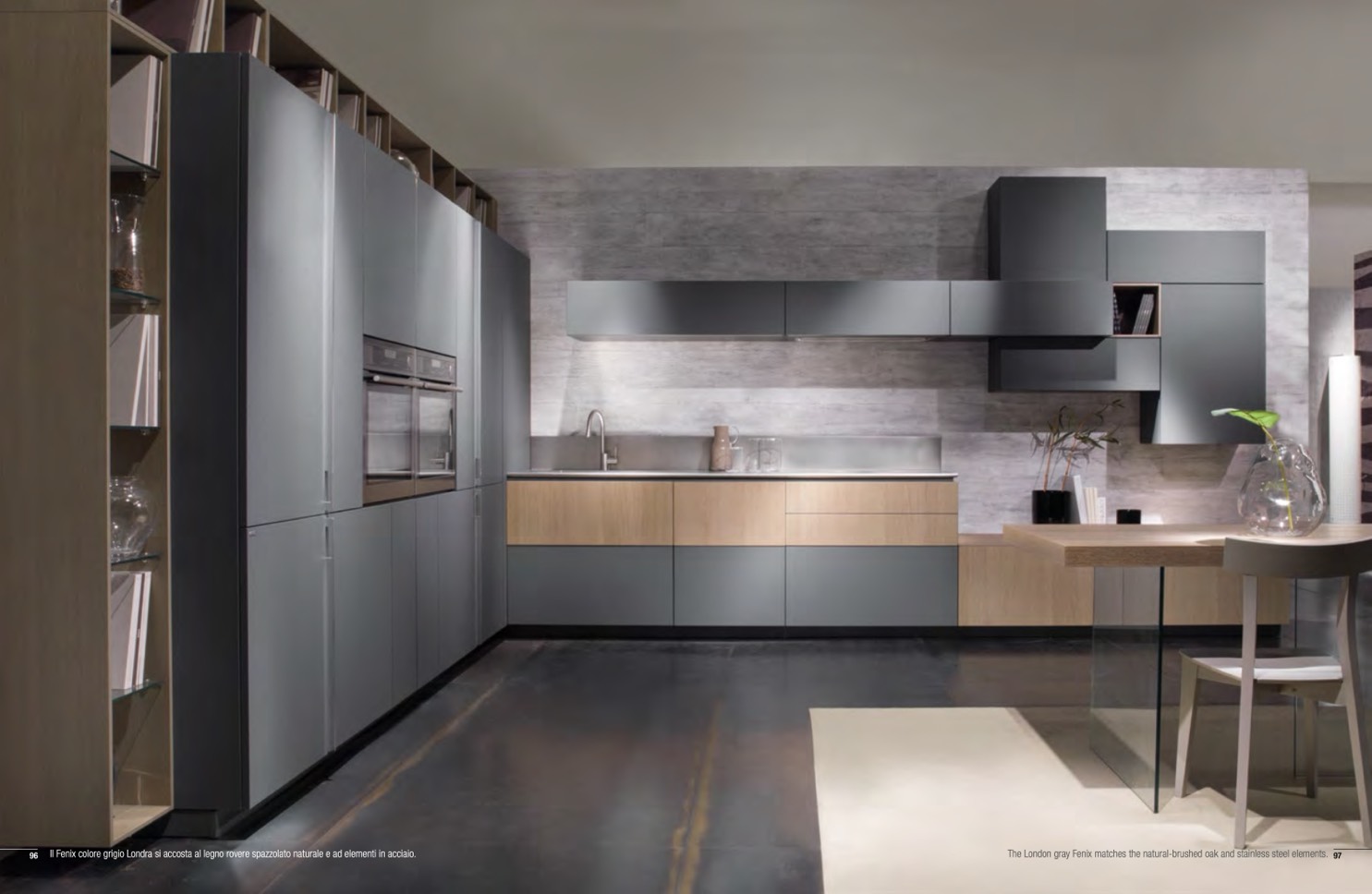 The London gray Fenix matches the natural-brushed oak and stainless steel elements. 97