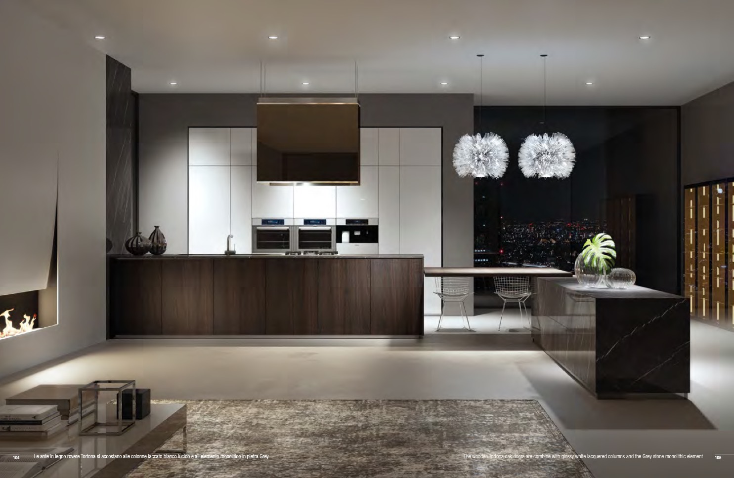 The wooden Tortona oak doors are combine with glossy white lacquered columns and the Grey stone monolithic element