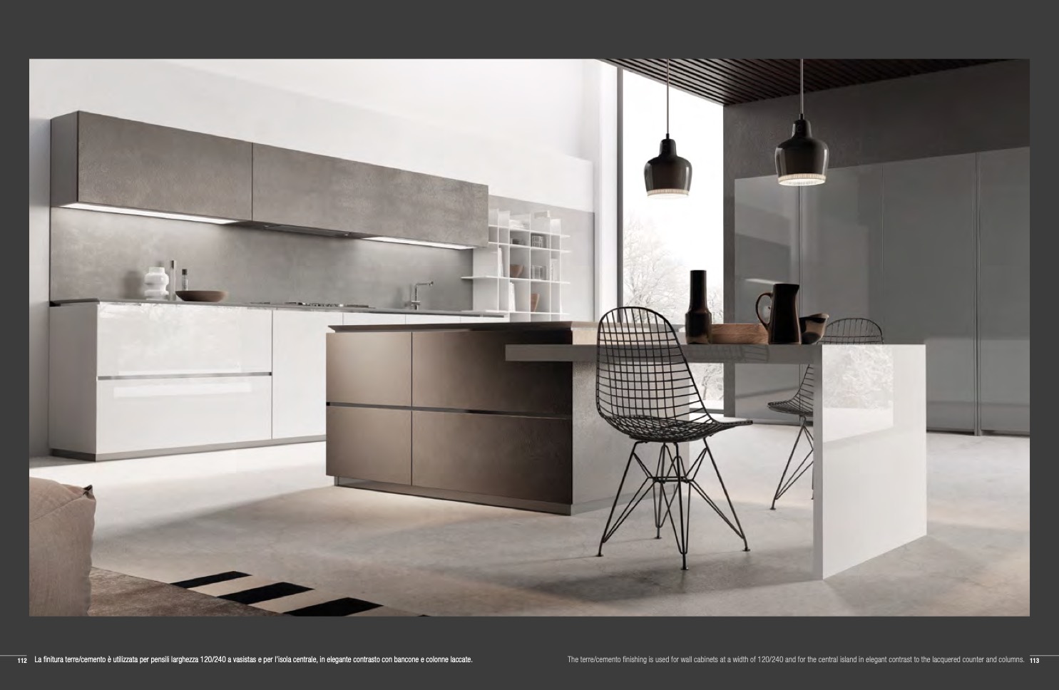 The terre/cemento finishing is used for wall cabinets at a width of 120/240 and for the central island in elegant contrast to the lacquered counter and columns. 113