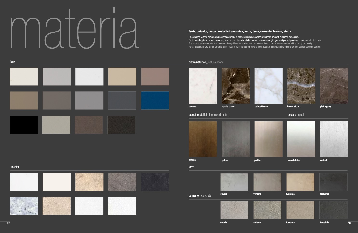 Fenix, unicolor, pietre naturali, ceramica, vetro, acciaio, laccati metallici, terra e cemento sono gli ingredienti per sviluppare un nuovo concetto di cucina.