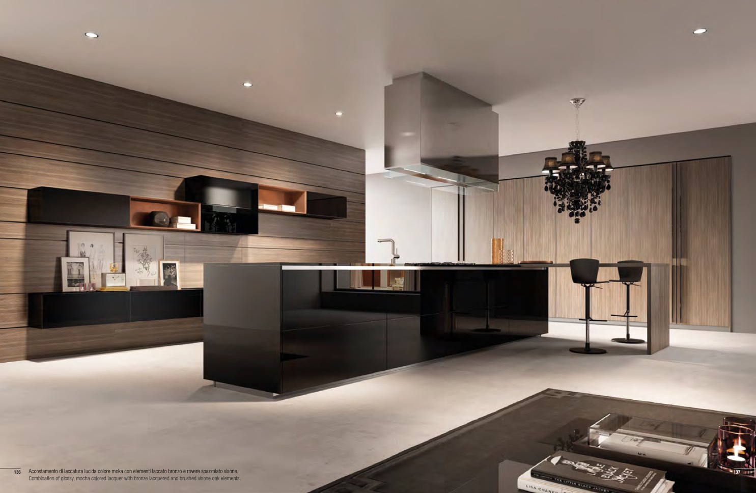 Combination of glossy, mocha colored lacquer with bronze lacquered and brushed visone oak elements.