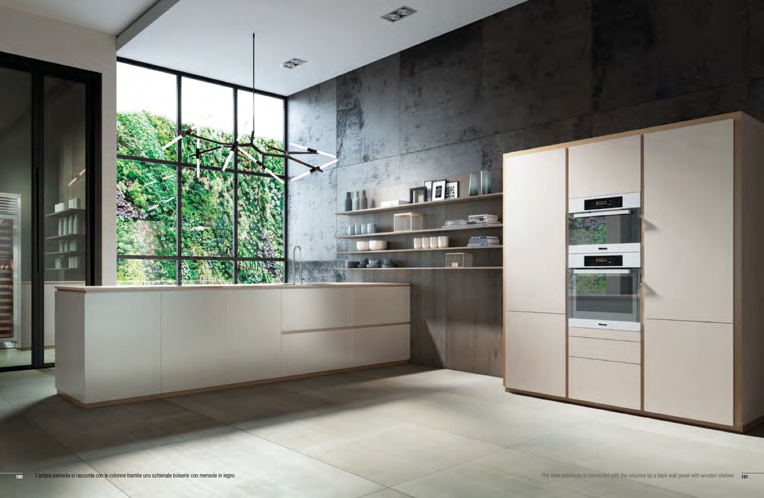 L’ampia penisola si raccorda con le colonne tramite uno schienale boiserie con mensole in legno