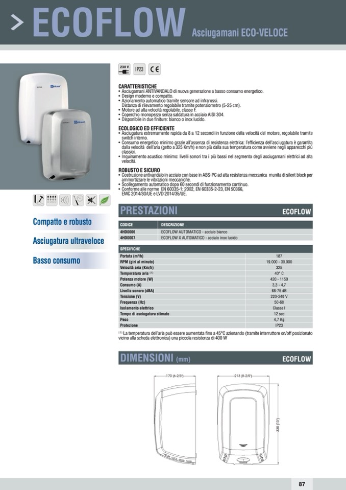• Inquinamento acustico minimo: livelli sonori tra i più bassi nel segmento degli asciugamani elettrici ad alta