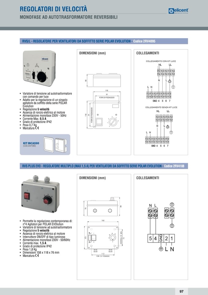RVS PLUS EVO - REGOLATORE MULTIPLO (MAX 1,5 A) PER VENTILATORI DA SOFFITTO SERIE POLAR EVOLUTION - Codice 2RV4108