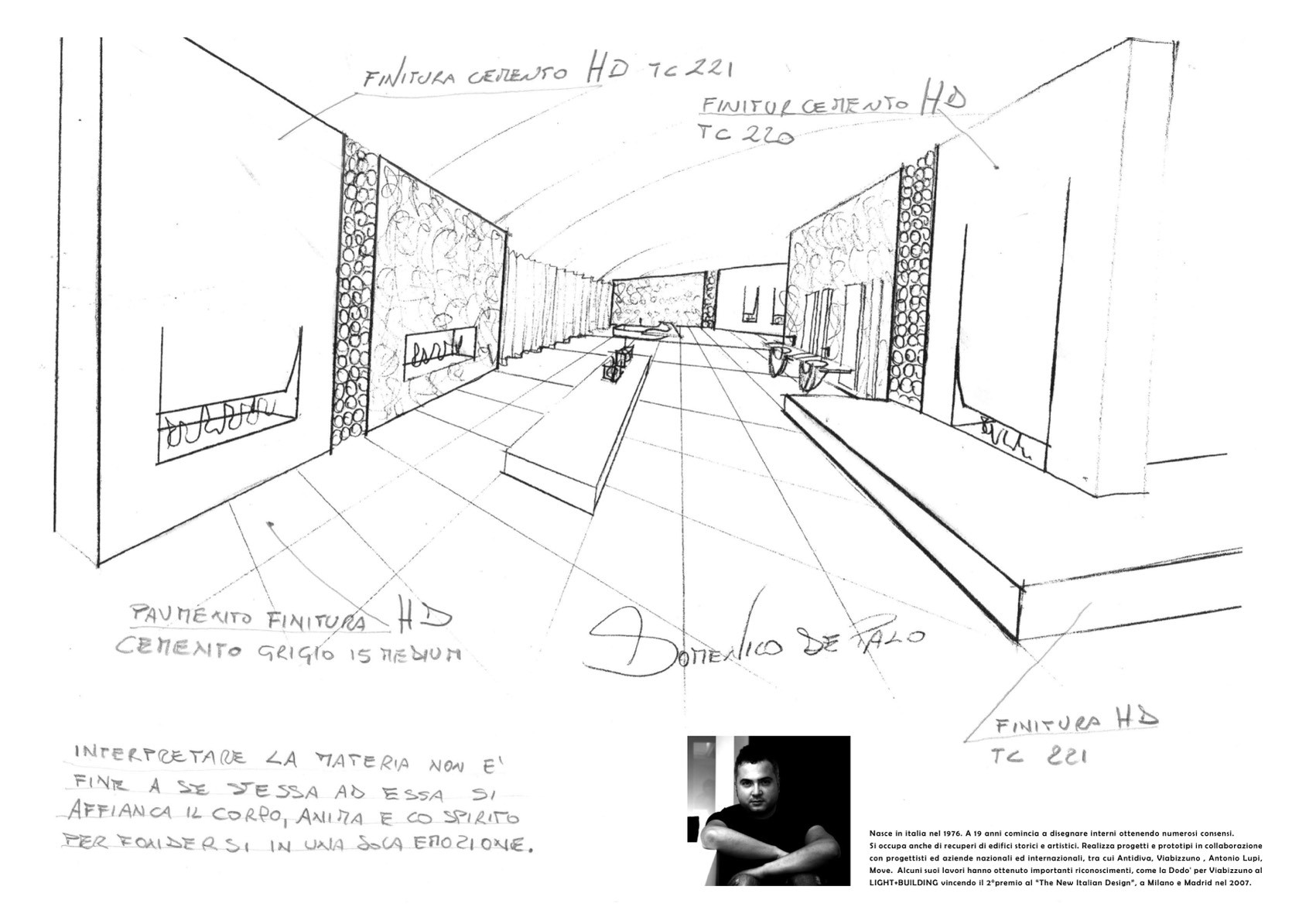 Nasce in italia nel 1976. A 19 anni comincia a disegnare interni ottenendo numerosi consensi.