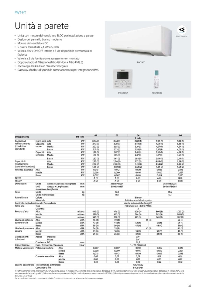 (1) Raffrescamento: temp. interna 27°CBS, 19°CBU; temp. acqua in ingresso 7°C, aumento della temperatura dell'acqua di 5°K. | (2) Riscaldamento: 2 tubi: aria 20°CBU; temperatura dell'acqua in entrata 45°C, calo