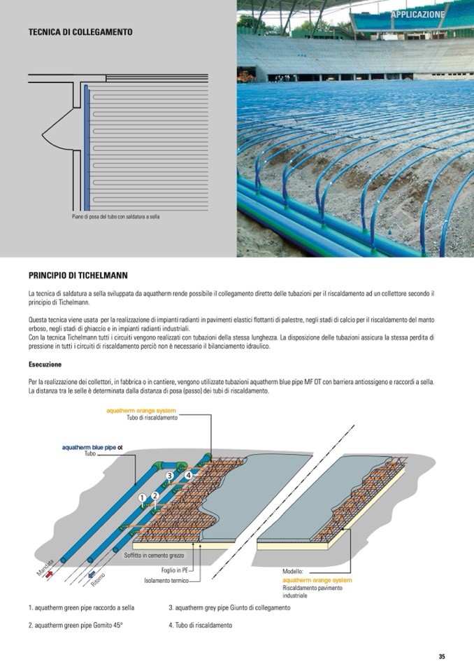 Questa tecnica viene usata per la realizzazione di impianti radianti in pavimenti elastici flottanti di palestre, negli stadi di calcio per il riscaldamento del manto