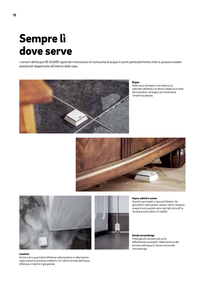 I sensori dell’acqua RE.GUARD opzionali riconoscono la fuoriuscita di acqua in punti particolarmente critici e possono essere