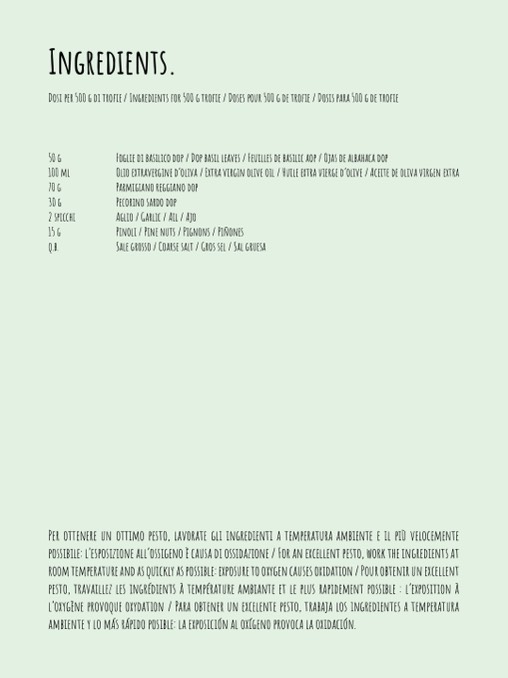 Dosi per 500 g di trofie / Ingredients for 500 g trofie / Doses pour 500 g de trofie / Dosis para 500 g de trofie