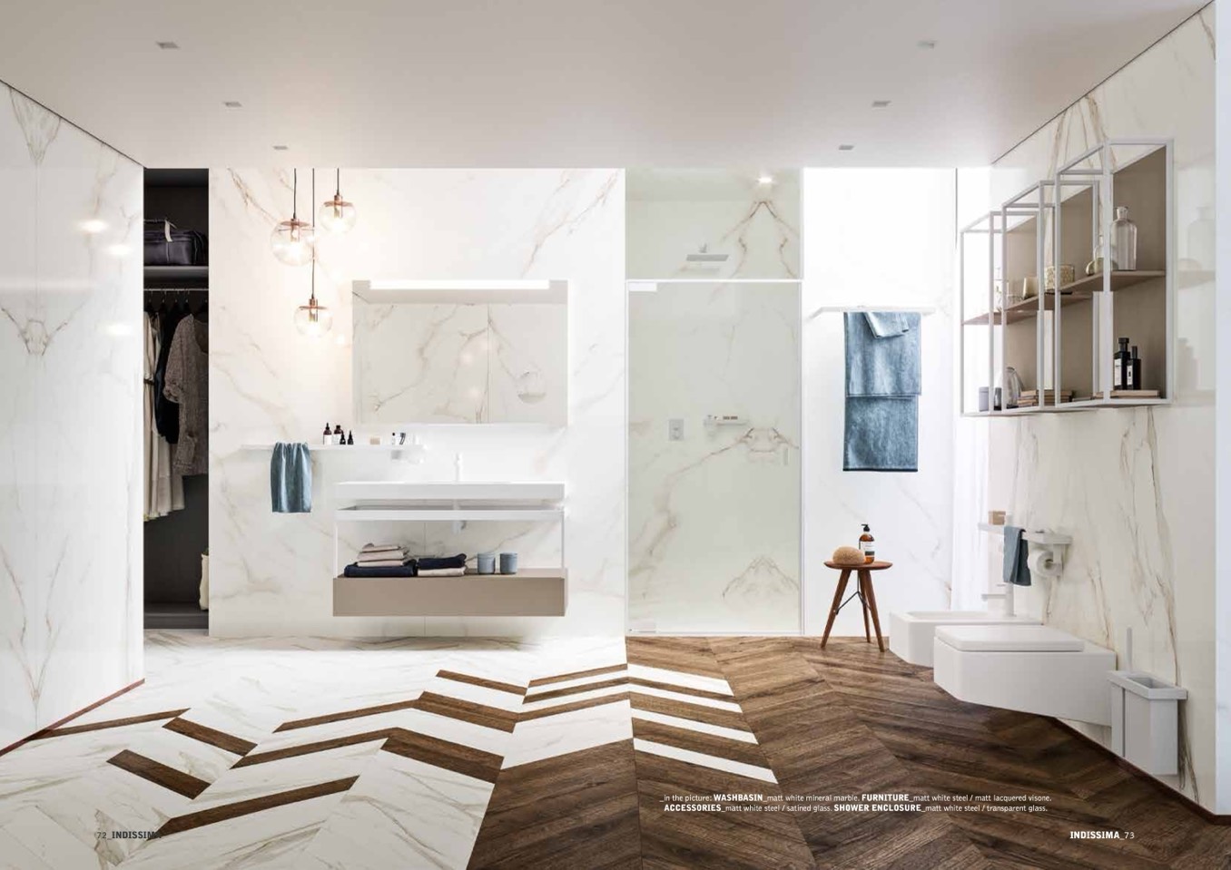 ACCESSORIES_matt white steel / satined glass. SHOWER ENCLOSURE_matt white steel / transparent glass.