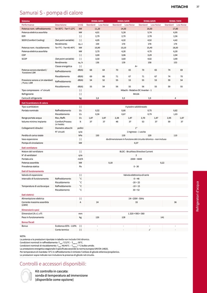 La potenza e le prestazioni riportate in tabella non includo il kit idronico.