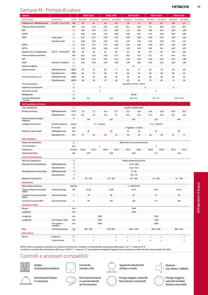 NOTA: Potenza e prestazioni indicate non includono il kit idronico. Condizioni nominali freddo: temperatura dell'acqua: 7/12 °C - T. esterna: 35 °C.