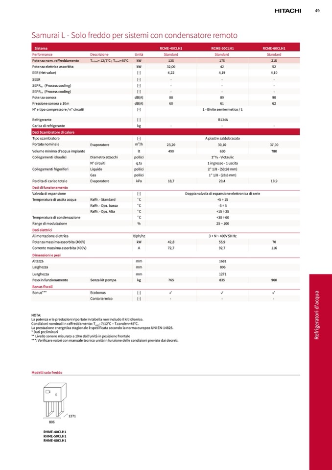 La potenza e le prestazioni riportate in tabella non includo il kit idronico.