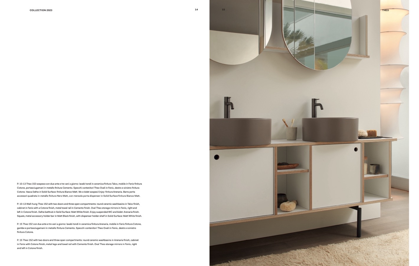 P. 15 Theo 152 with two doors and three open compartments: round ceramic washbasins in Arenaria finish, cabinet