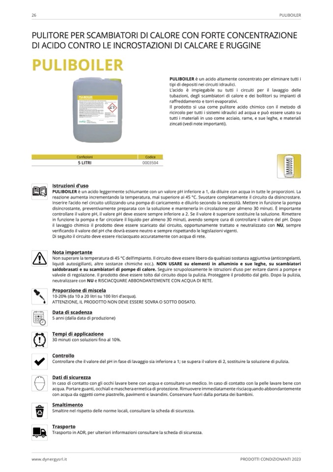 PULIBOILER è un acido leggermente schiumante con un valore pH inferiore a 1, da diluire con acqua in tutte le proporzioni. La