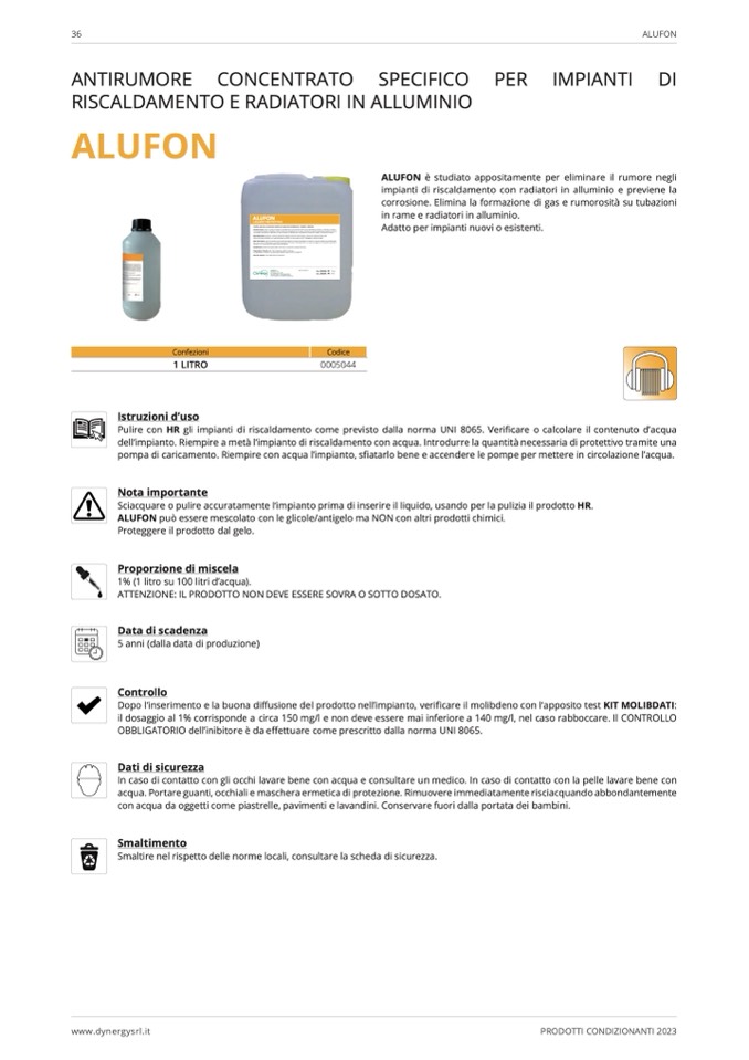 Alufon può essere mescolato con le glicole/antigelo ma NON con altri prodotti chimici. Proteggere il prodotto dal gelo.