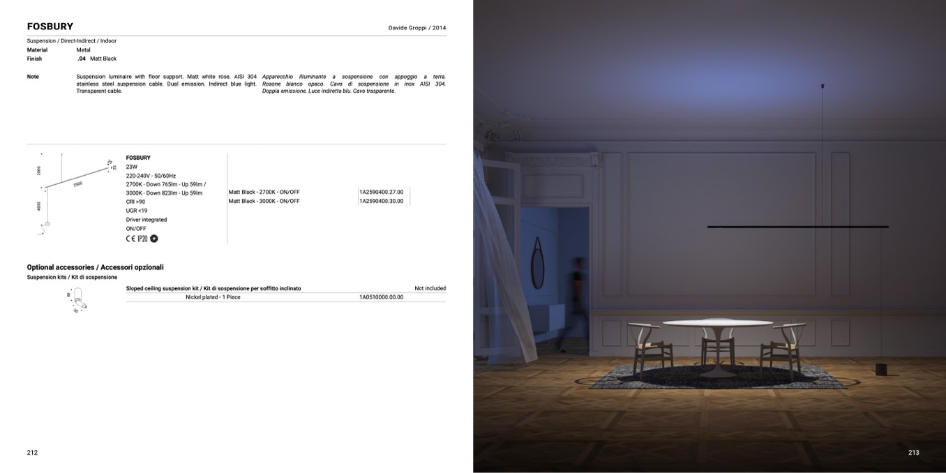 stainless steel suspension cable. Dual emission. Indirect blue light. Rosone bianco opaco. Cavo di sospensione in inox AISI 304.