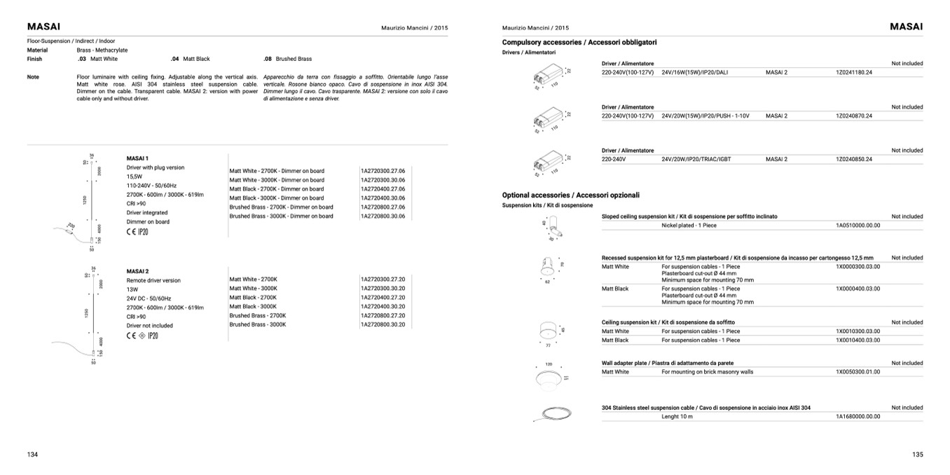 verticale. Rosone bianco opaco. Cavo di sospensione in inox AISI 304.