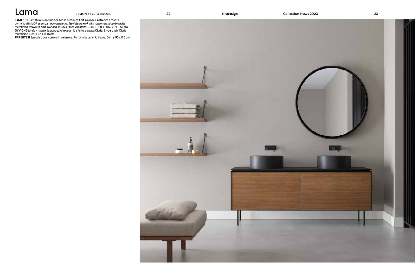 contenitivi in MDF essenza noce canaletto. Steel framework with top in ceramica Antracite