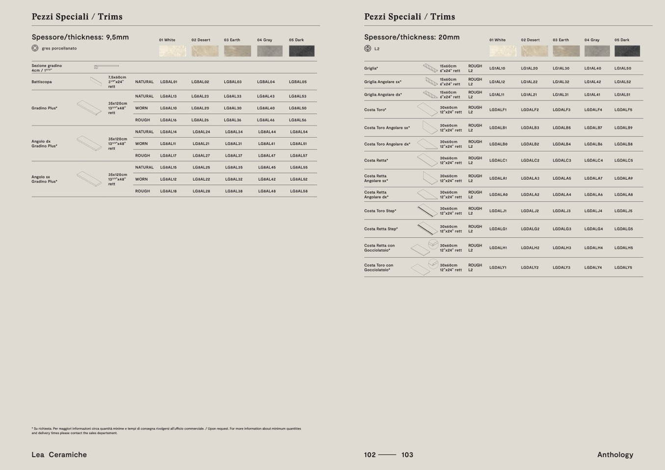à minime e tempi di consegna rivolgersi all’ufficio commerciale. / Upon request. For more information about minimum quantities