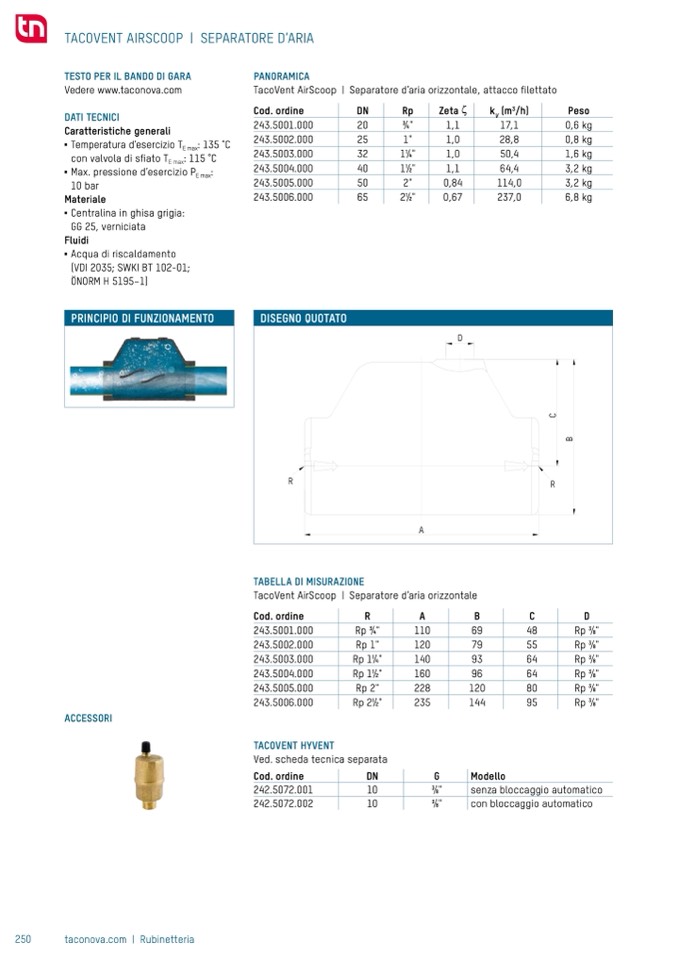 TacoVent AirScoop | Separatore d’aria orizzontale, attacco filettato