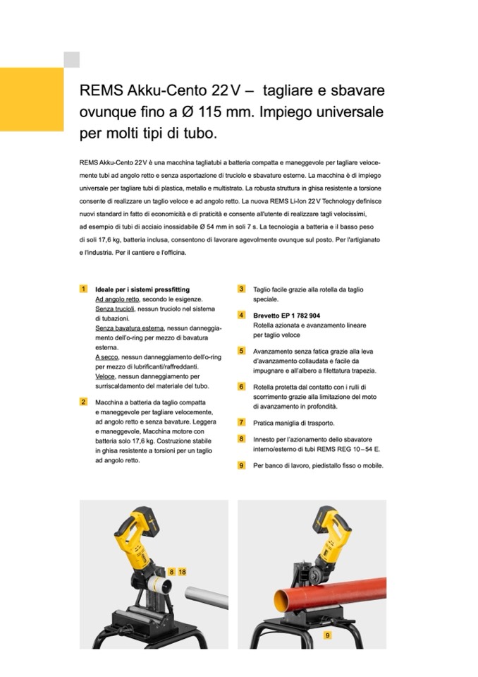consente di realizzare un taglio veloce e ad angolo retto. La nuova REMS Li-Ion 22 V Technology definisce