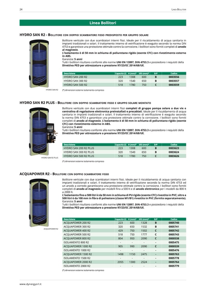 Tutti i bollitori risultano conformi alle norme UNI EN 12897, DIN 4753.3 e possiedono i requisiti della