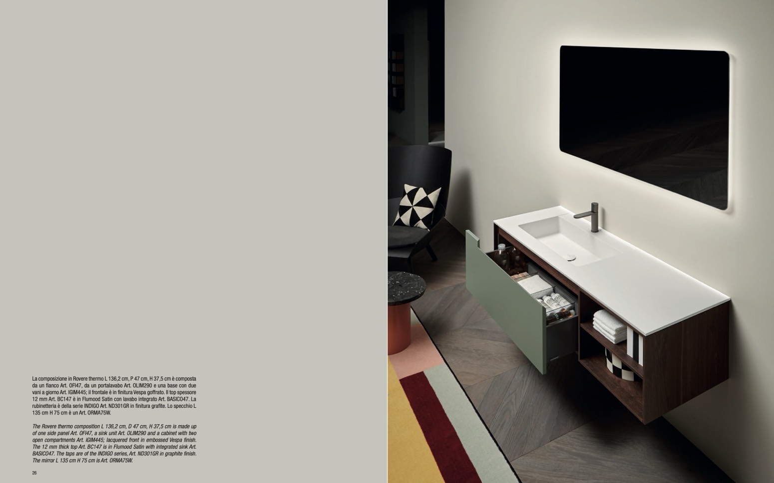 rubinetteria è della serie INDIGO Art. ND301GR in finitura grafite. Lo specchio L