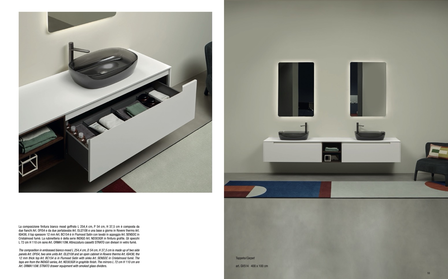 IGI436; il top spessore 12 mm Art. BC154 è in Flumood Satin con lavabi in appoggio Art. SENSOC in