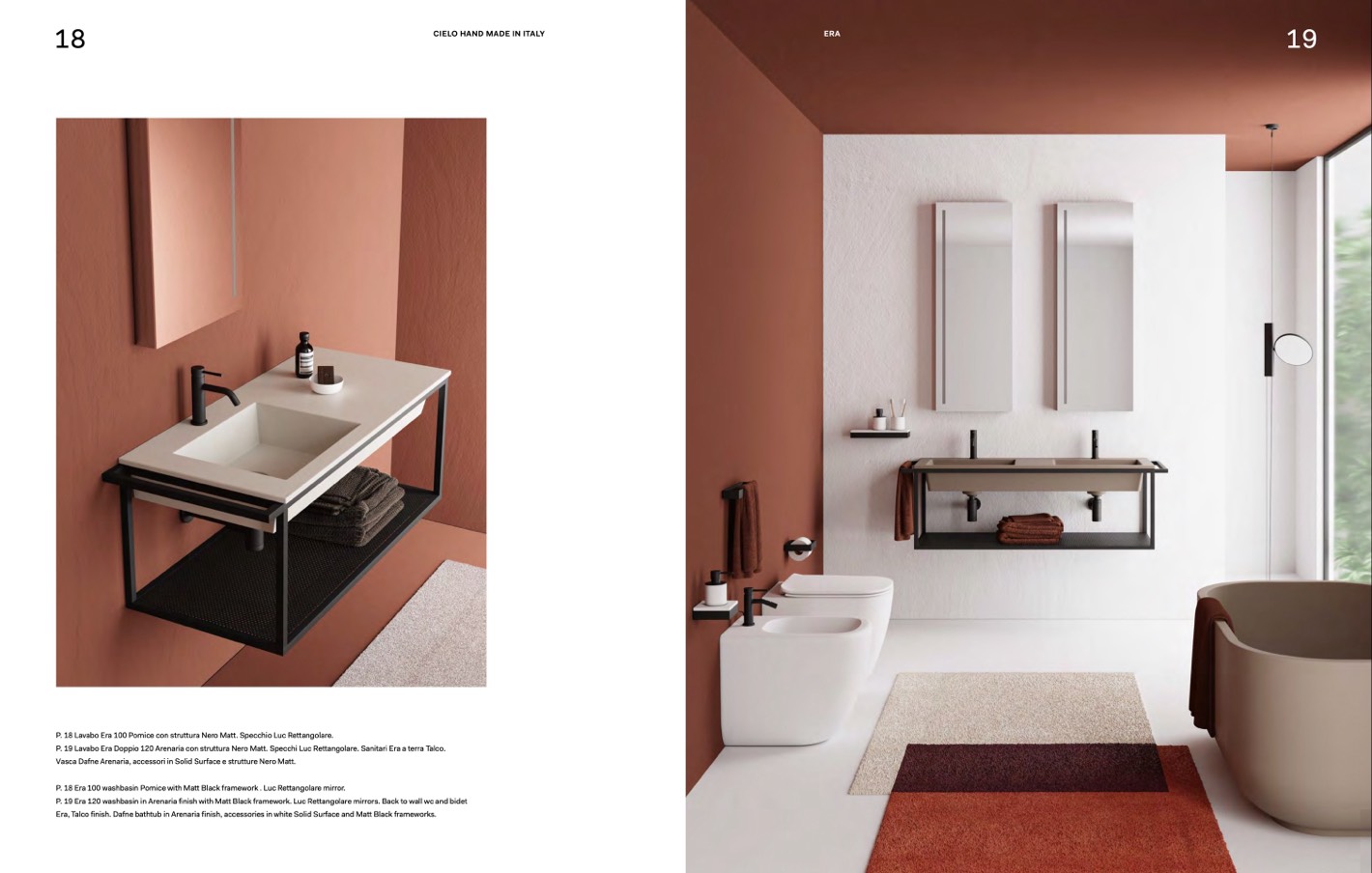 P. 19 Era 120 washbasin in Arenaria finish with Matt Black framework. Luc Rettangolare mirrors. Back to wall wc and bidet